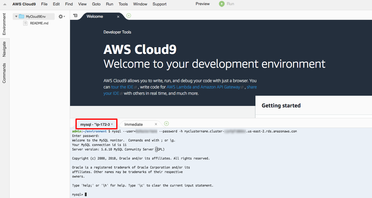Di tab termimal bash dalam MyCloud9Env, ketik perintah berikut. Ganti titik akhir nama pengguna dan database Master dengan nilai-nilai dalam perintah dan tekan Enter.